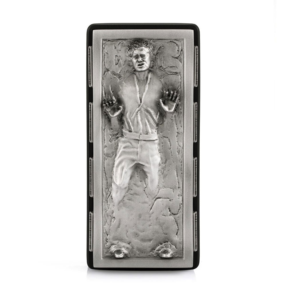 The Corellian suffers freezing in carbonite by Vader, only to be delivered as bounty to Jabba, where he becomes much prized interior decoration. As the Hutt says, ?I like Captain Solo where he is.? Given this container?s exceptional detail, you might too.Reproduced in pewter, the lid features Solo encased in the carbonite matrix, the slab complete with its monitoring panels. Sized to accommodate business cards or writing instruments, the matt black composite resin container draws from the film?s design language.