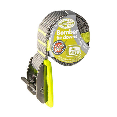 This all purpose tie down features die cast nickel plated zinc alloy buckles with a rubber protector pad. The webbing has been upgraded to 25mm UV protected polyester webbing. A handy, colour-coordinated elasticised webbing retainer keeps the tie downs neatly coiled when not in use.