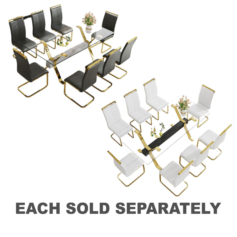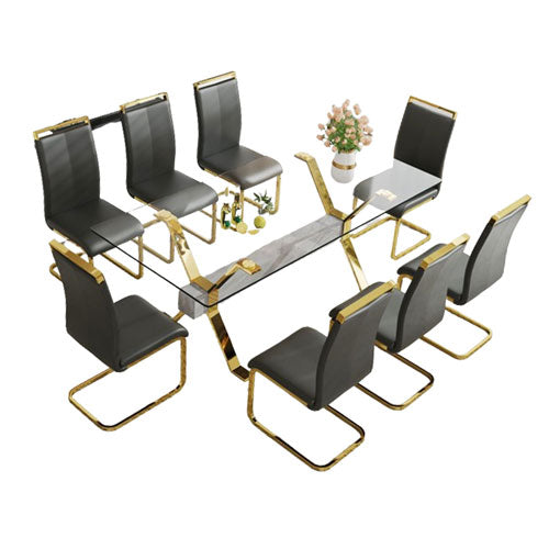Enhance your dining area with the sophisticated and elegant design of this tabletop that can seat 8 people comfortably. It has gold-plated dining chairs that add a touch of luxury to any space.This dining table is made out of tempered glass material with elegant gold electroplated metal that exudes modernity and style, creating a visually appealing centerpiece in your dining room.It is crafted with durability in mind, this dining table is built to last and it comfortably accommodates 8 people, providing ample room for enjoyable meals, family gatherings, or entertaining guests.Featuring a sturdy MDF crossbar in the center, this table can withstand heavy weight and it can also be used as a storage space. Not only looks stunning but also offers easy maintenance. Simply wipe it clean with a damp cloth, and it will remain pristine and beautiful.This versatile dining table is not only suitable for meals but also serves as a stylish workspace for various activities and adds a touch of soph