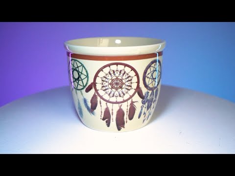 - Feathered dreamcatcher design on a cream-colored bowl.